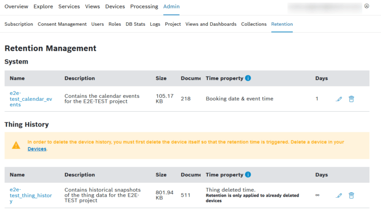 Now the project admin can set a retention time of X days to have them purged automatically from device history X days after deletion date. - User accounts, a admin can define if non used accounts are deleted from his subscription.
