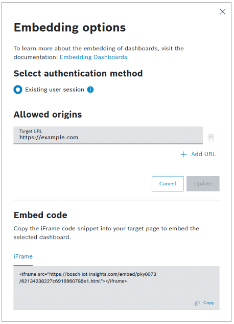 Pass your frame server URL into the Bosch IoT Insights iFrame by using the prefixUrl parameter in the URL. Assuming https://your-frame-server.com/insights is your frame server URL on which you’d like to embed your Bosch IoT Insights Project, add the Parameter as follows: