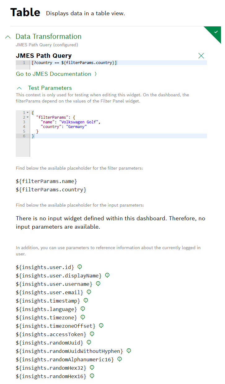 You can configure your JMES Path Query from the Data Transformation pane. When editing a widget, you can view all available placeholders in the Test Parameters tab. See the example below::