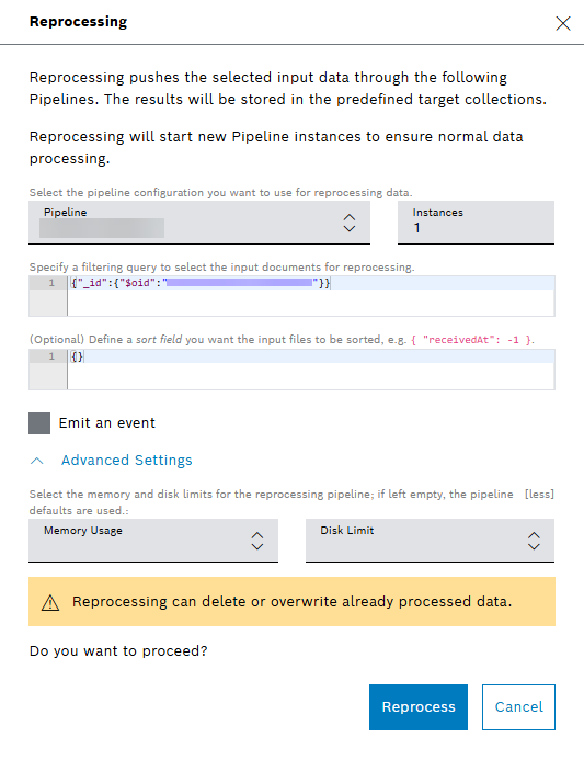 The reprocessing is improved so that now you have the option to receive notifications by enabling the Emit an event checkbox in the re-processing dialog. By default, this option is disabled: