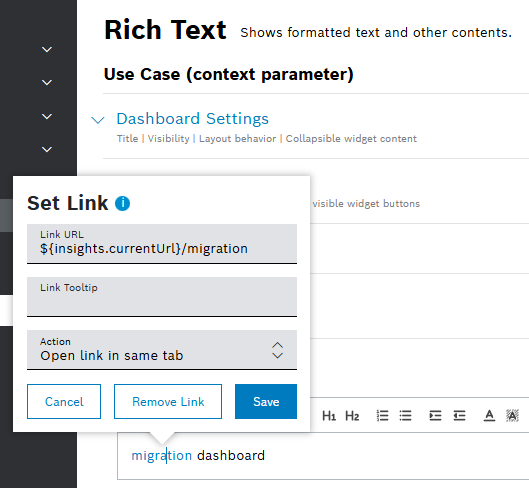 The parameter is available in the basic widget context. The following is an example of how to set the link with the ${insights.currentUrl} placeholder: