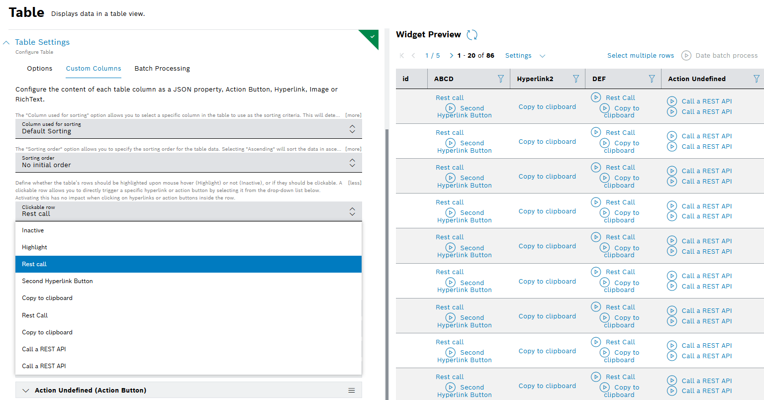 Regarding the Hyperlink/Action button options of the 'Clickable row' functionality, the drop-down list also displays all defined hyperlink or action buttons: