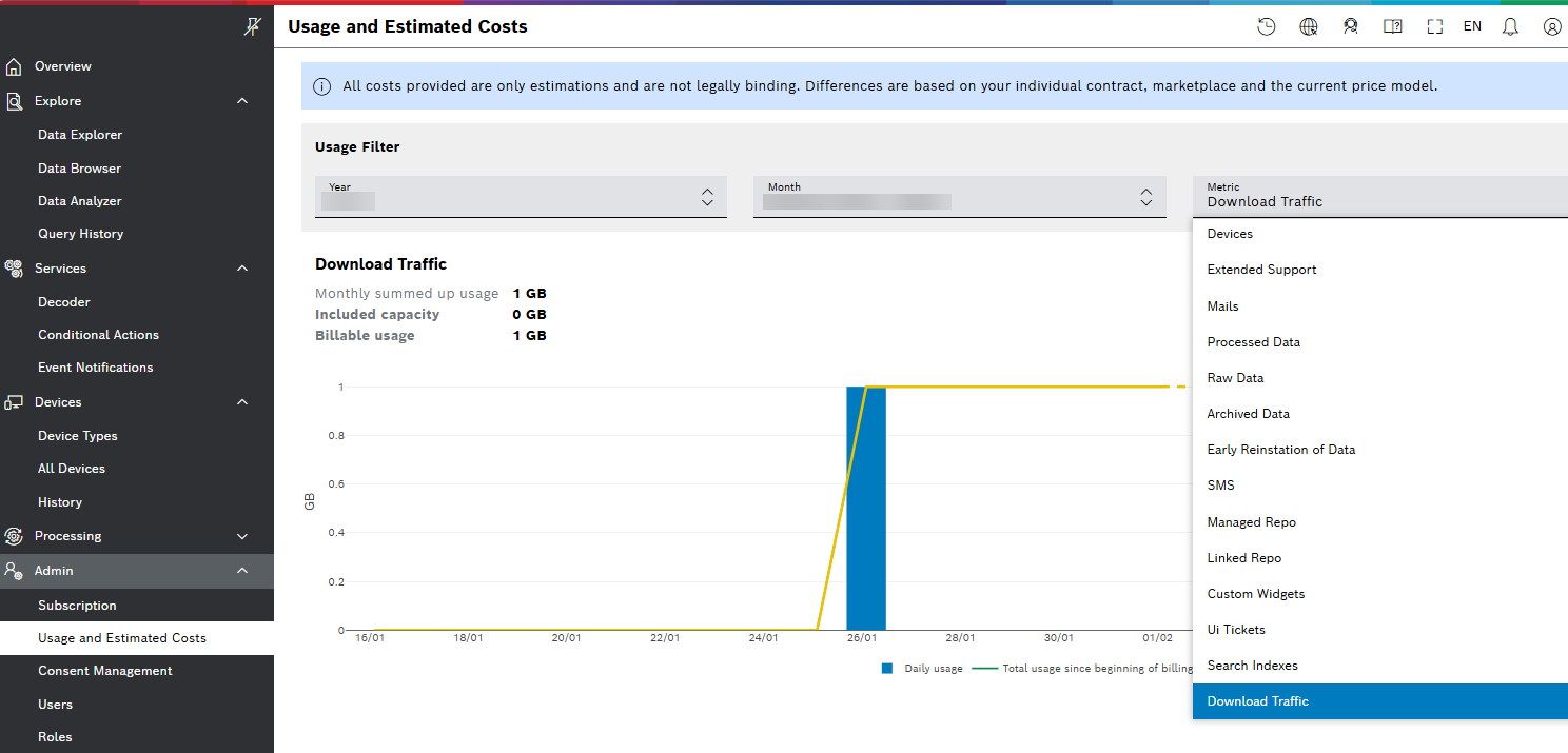 As a project administrator, you can monitor the accumulated download traffic per billing month by navigating to Admin > Usage and Estimated Costs > Metric, and selecting the new Download Traffic option from the drop-down menu: