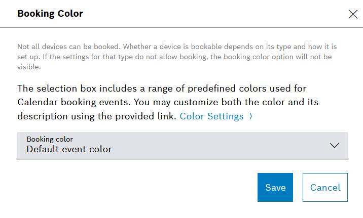 → The Booking Color dialog is displayed. - From the drop-down list, select a color which will be automatically applied to all bookings which involve this device.