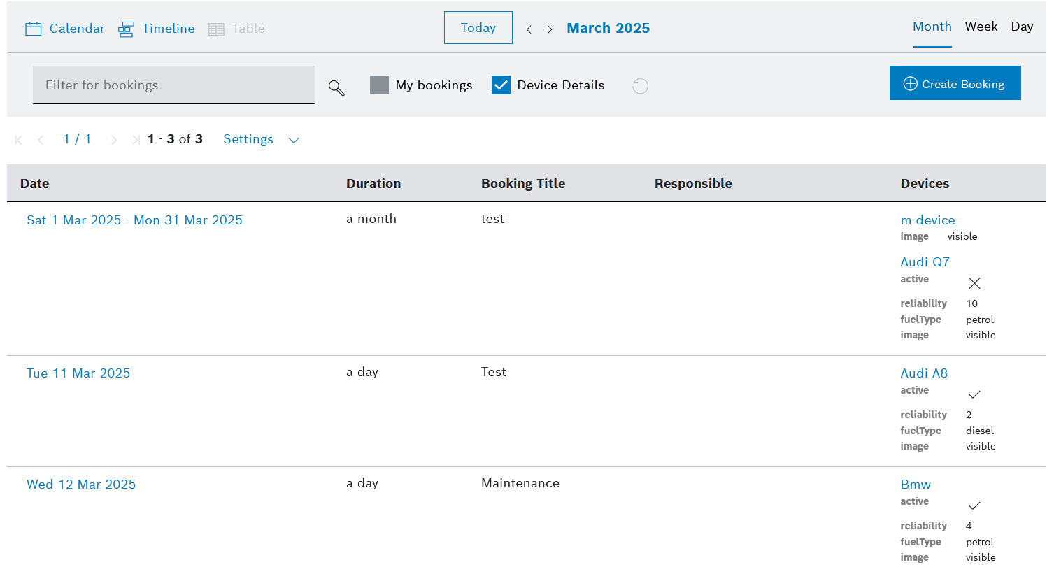 Using the Calendar widget, you can create bookings for devices. You can also create bookings for appointments that do not have to be linked to devices. The calendar can be displayed by month, week, or day.