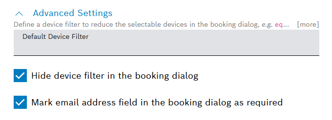 - Open the Advanced Settings drop-down menu to define a default filter for the devices that shall be displayed for booking.