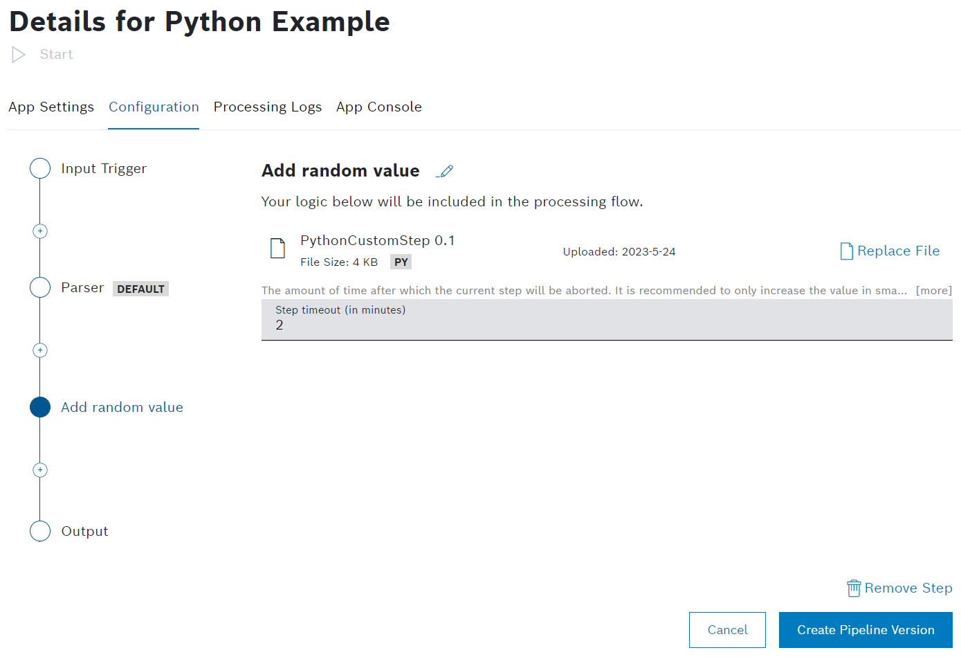 - Open the Pipelines: Configuring the custom step chapter and download the Python code example.