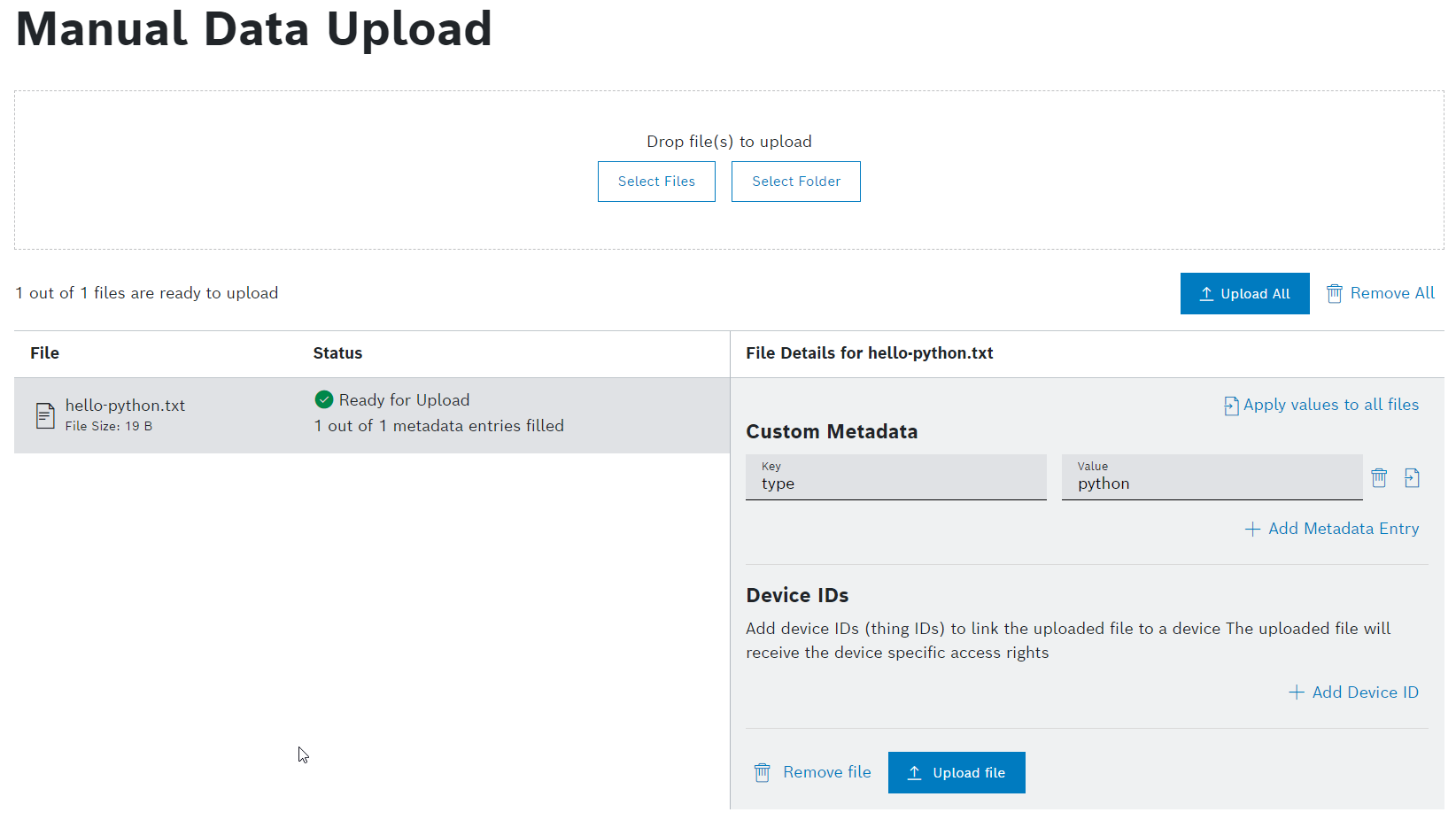 → The file is added. - Click the + Metadata button to add the python type.