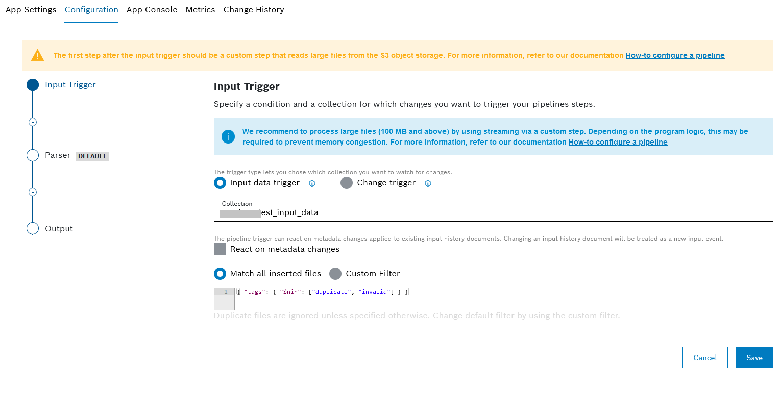 Therefore you need to create a custom step that can handle two types of input files. First you have to change the configuration in the manifest to get payload references for large files (>10 KB), small files are directly embedded in the injected data. Then configure the corresponding custom step, for more information on how to configure such a step refer to the code examples and the corresponding README files in the Pipelines: Configuring the custom step.