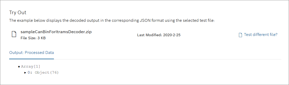 - Optionally, test the iTrams decoder. Therefore, select or drop a bin file in the attachment box of the Try Out section. If the file was the decoded, the processed data is shown.