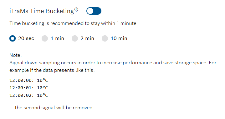 - In case of an existing iTraMS Parser, there is an iTraMS Time Bucketing section. Optionally, select a time bucket size or turn it off completely.