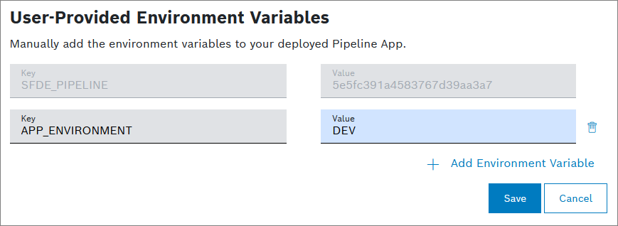 In the following image, you see that the environment variable APP_ENVIRONMENT=DEV has been set. The SFDE_PIPELINE environment variable is set by default and cannot be changed.