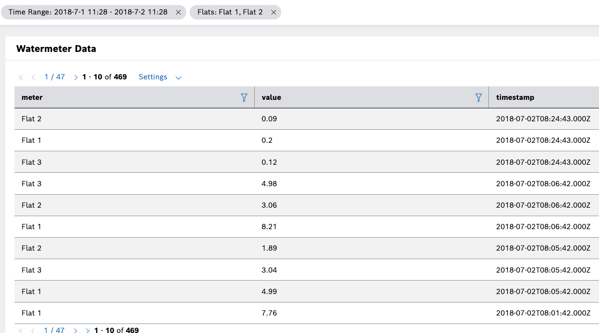 It contains measurement data related to the water consumption by several flats in a building. The smart water meters have reported the data with a flat ID, a value, and a timestamp for each measurement.