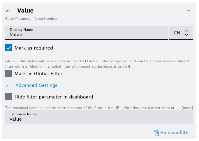 - Add a Number filter type with filter name Value and technical name value.