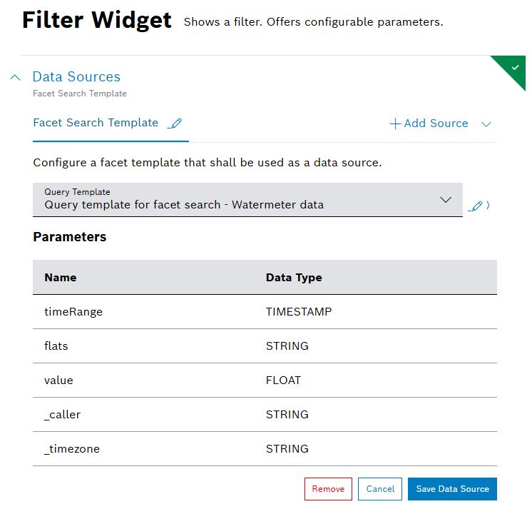- In the filter widget configuration editor that opens, add a data source as follows: