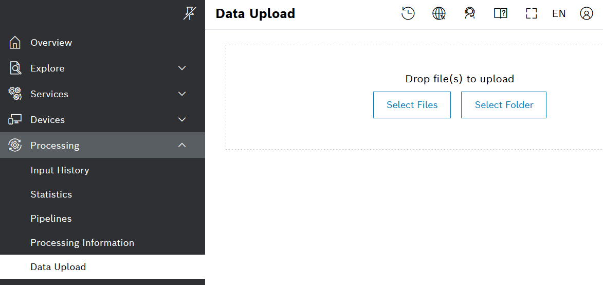 - On the left navigation, go to Processing > Data upload and click Select Files.
