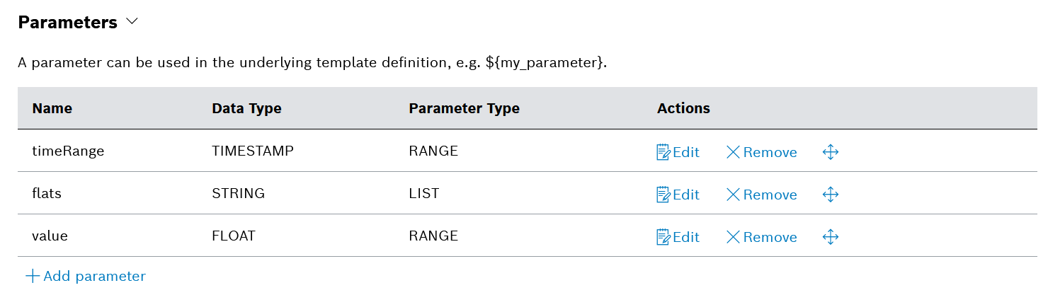 → The parameters should look like this: - In the Template Definition section, enter the following query: