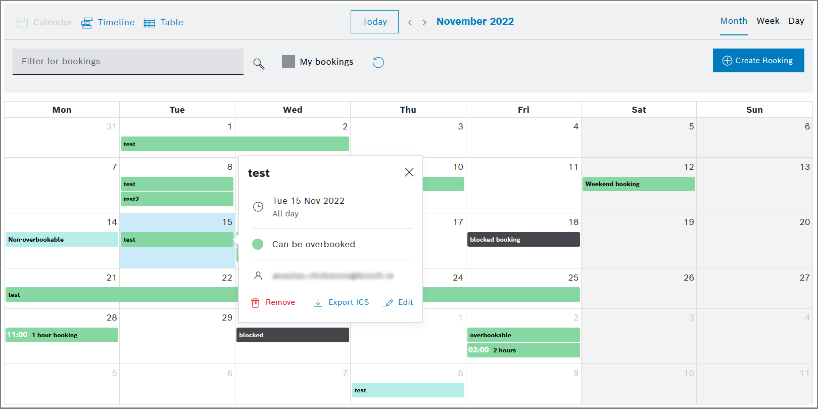 The time range can collide with a booking with the booking status Can be overbooked. The owner of the Can be overbooked booking receives a notification of the new booking with this status. - Blocked: The device and the time range cannot be booked again. A booking with the booking status Blocked has the highest priority. Owners of Can be overbooked and Non-overbookable bookings with that same device within the same time range receive a notification on the new booking with the Blocked status informing about the non-availability of the device in this time range.