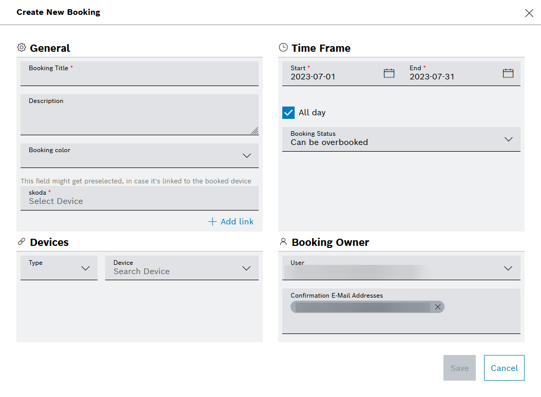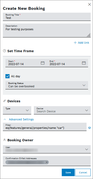 - Can be overbooked: The selected device can be booked multiple times at the same time range.