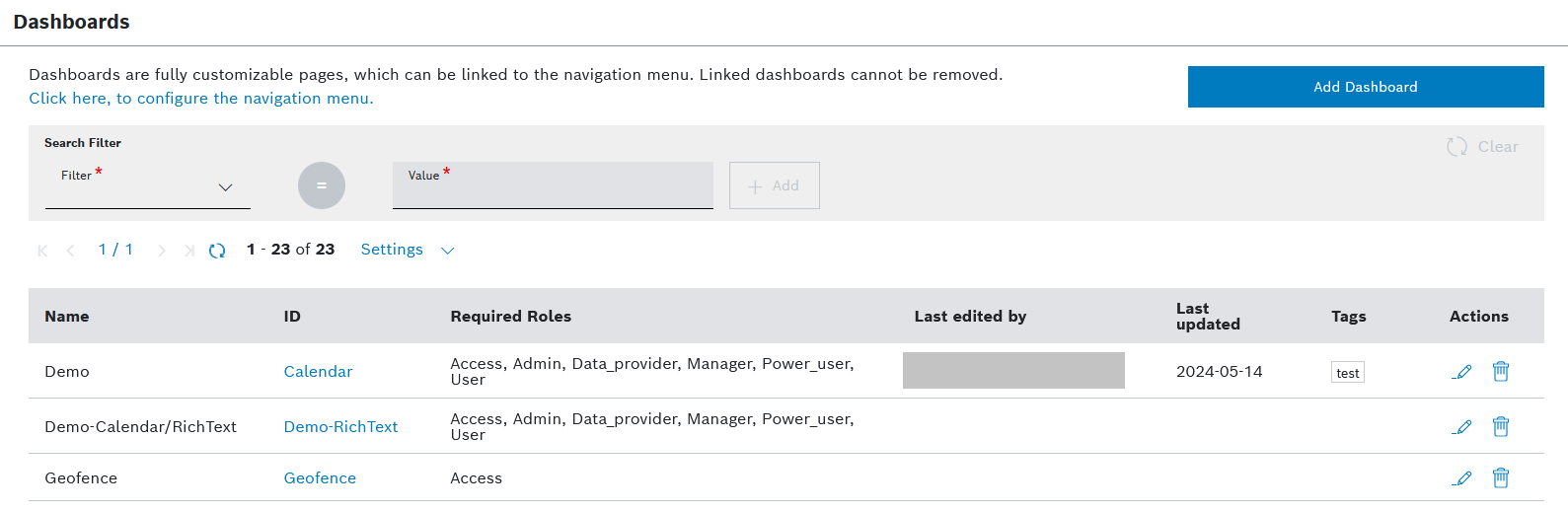 → The list of dashboards offers a search filter, pagination, sorting, as well as the possibility to remove and restore columns.