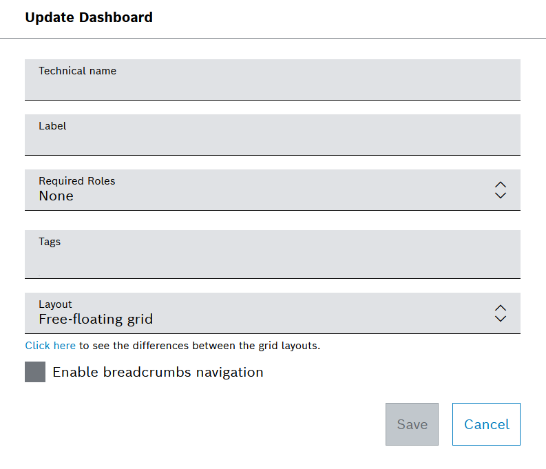 - Optionally, activate the checkbox for Enable breadcrumb navigation, which will display the different levels in case of nested dashboards.