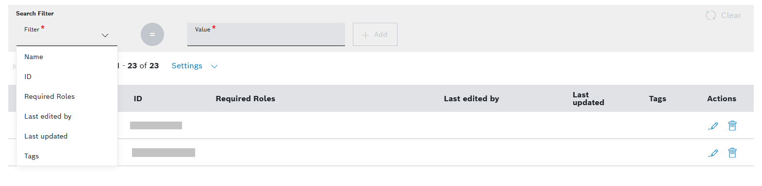 → The entered values are treated with an AND logic. - Apply the added filter(s) by clicking the Search button on the right. This button is available only after a filter has been added.