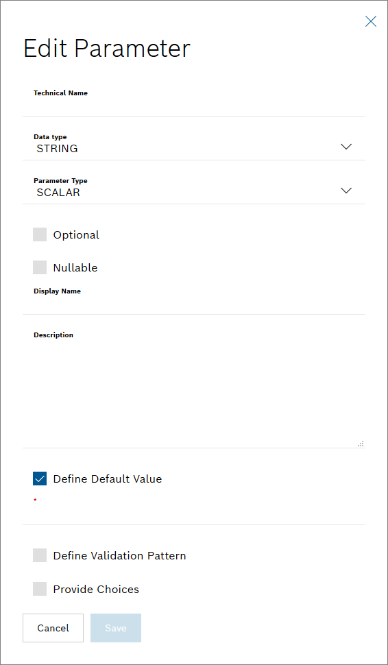 → The Edit Parameter dialog is displayed.- In the Technical Name field, enter the technical names of the following parameters: