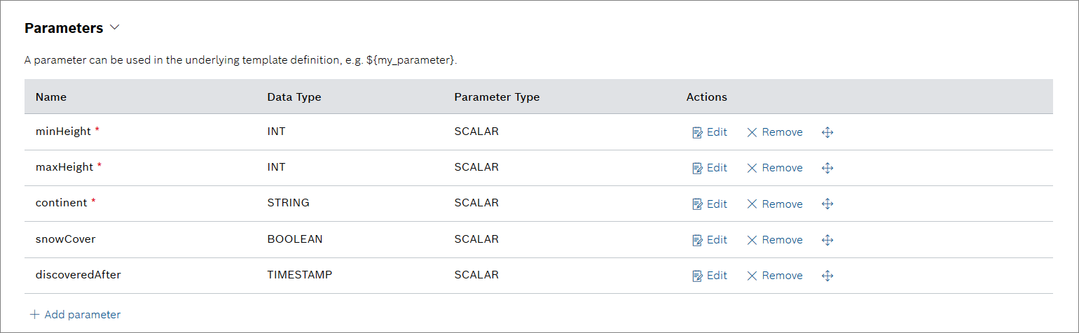Bosch IoT Insights can process, for instance, geographical and geological data of mountains around the world. Every mountain has its own characteristics, such as height, snow coverage, discovery date, and the location. A query template can be created to retrieve the data using the MongoDB query language. An external system or client then executes the query template with the desired parameters by invoking the custom endpoints' URL.