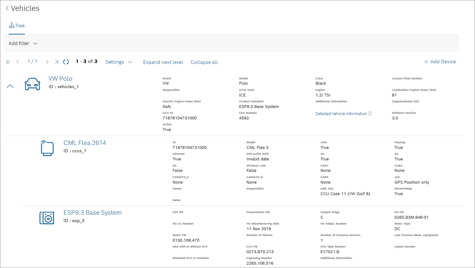 Access the Device Management through the Devices tab of the Bosch IoT Insights user interface. Devices, their properties, status, components, and relations can be viewed and managed. Devices are clustered by device types. The device types can be enriched with various properties. The device type properties serve as default properties for all affiliated devices.