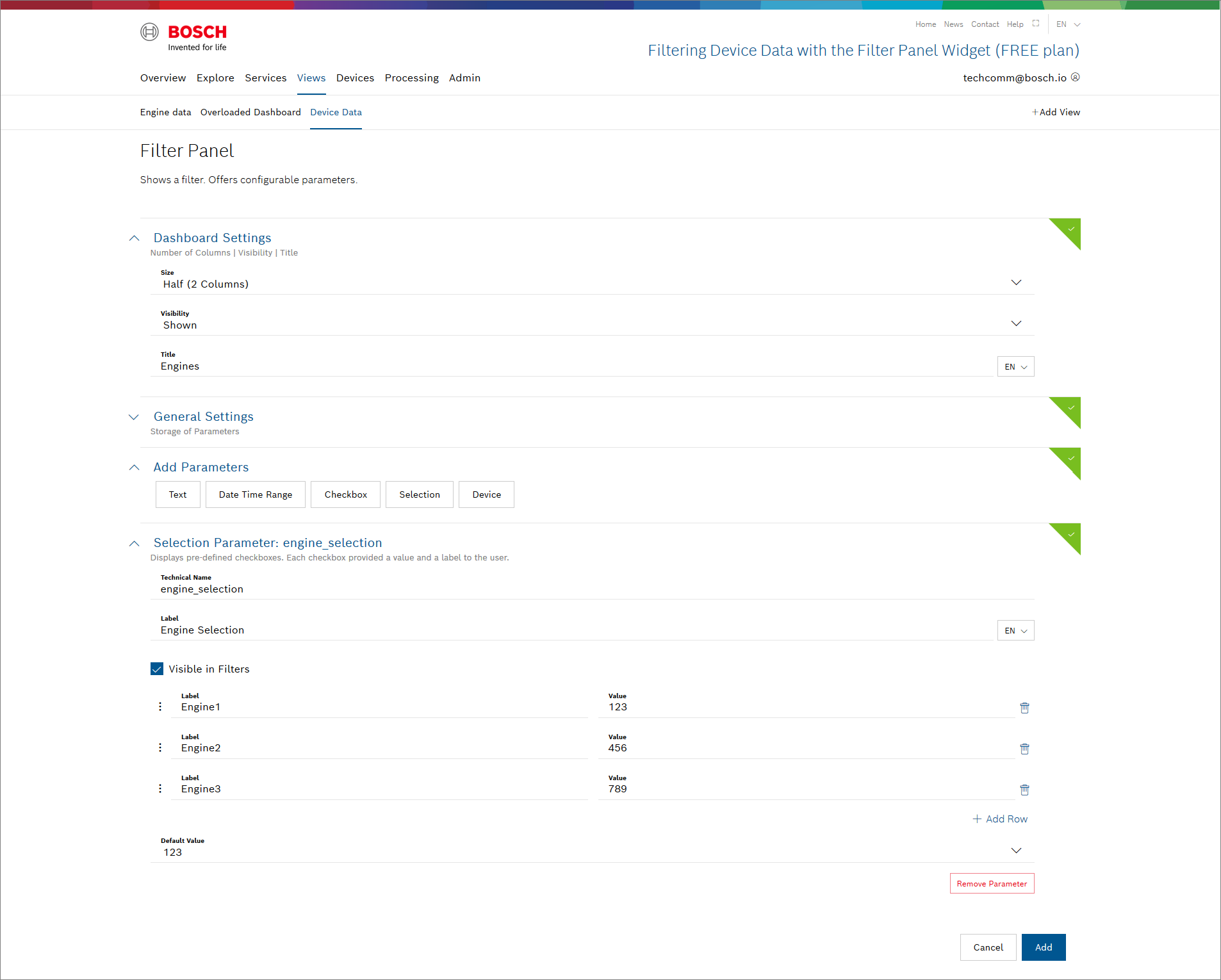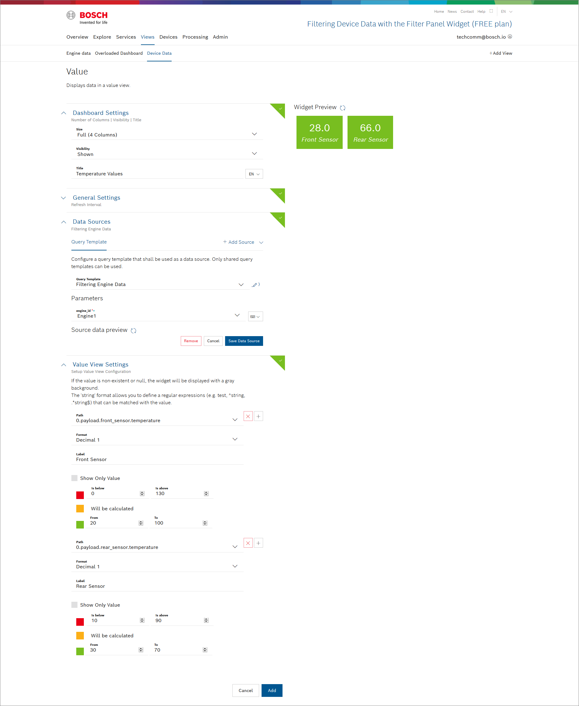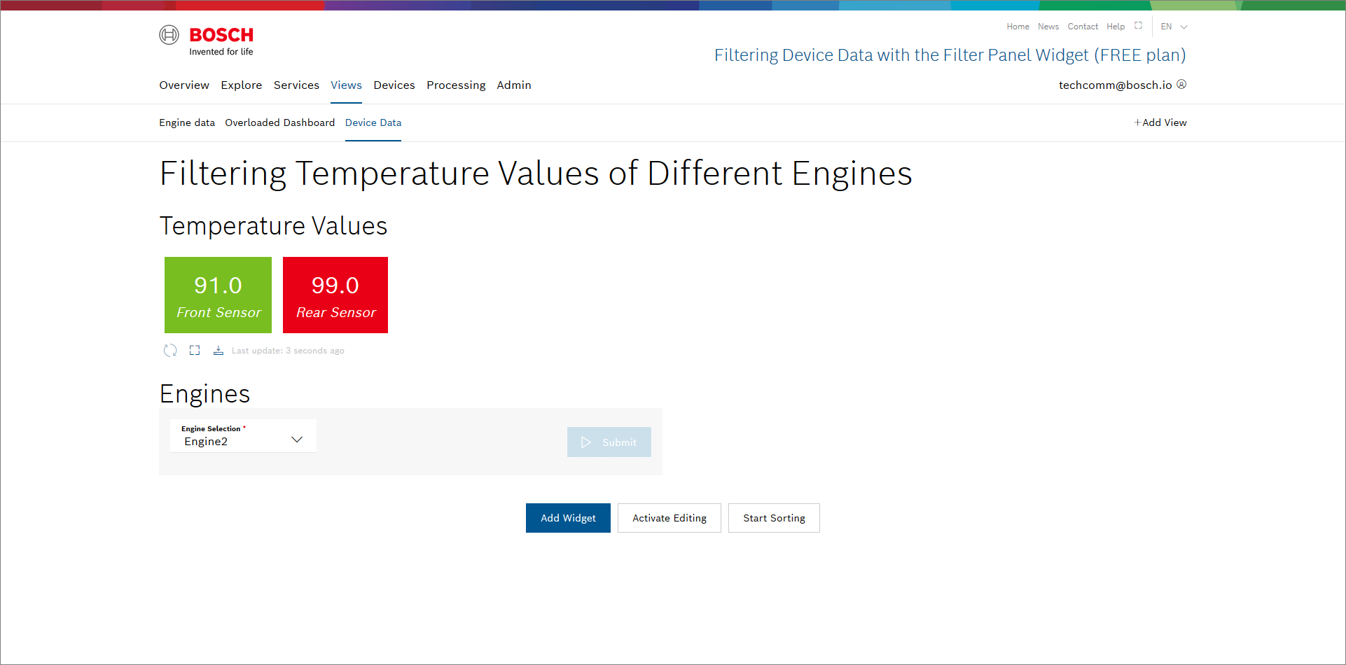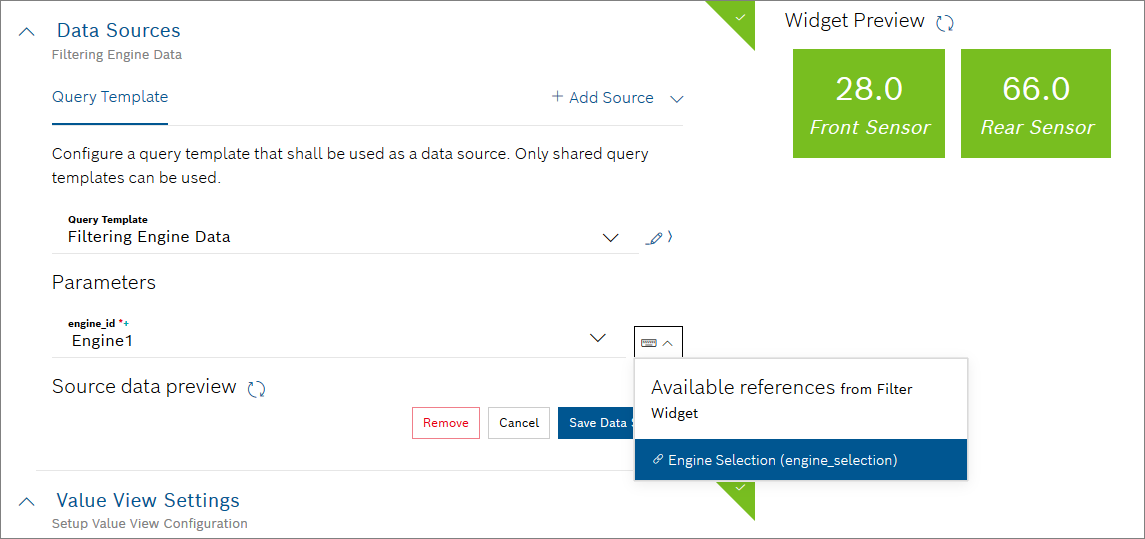 In this tutorial, we will display the temperature values of the front and rear sensors of three different engines. Therefore, we will create a Value widget as well as a Filter widget.
