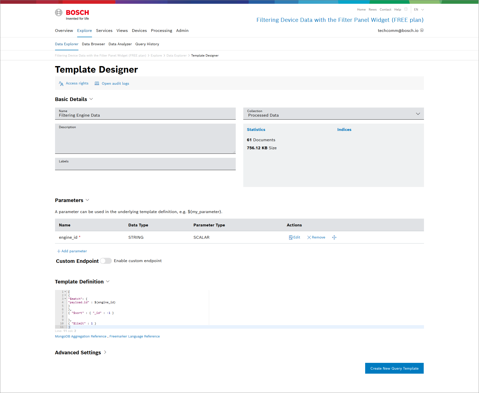 [{"$match": {"payload.id": ${engine_id}}},{"$sort": {"_id": -1}},{"$limit":1}]- Click the Create New Query Template button.