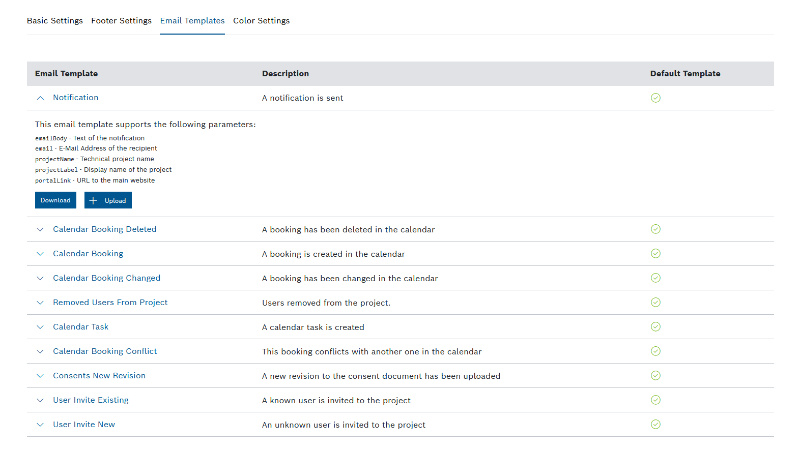In Email Templates, you can view the existing email templates that are used to communicate with other project members. The email templates can be adjusted by editing the downloaded file and uploading it back to Bosch IoT Insights.