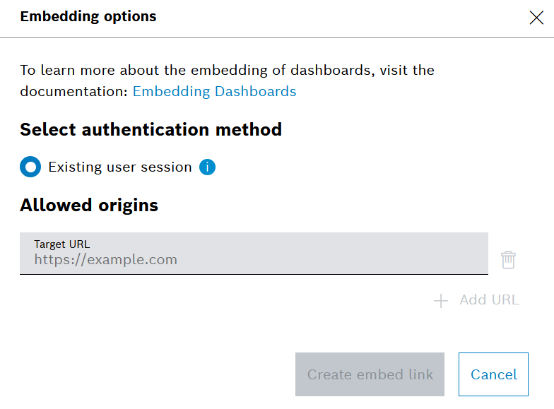 → The Embedding options dialog is displayed. In the Target URL, enter the URL of the external website.