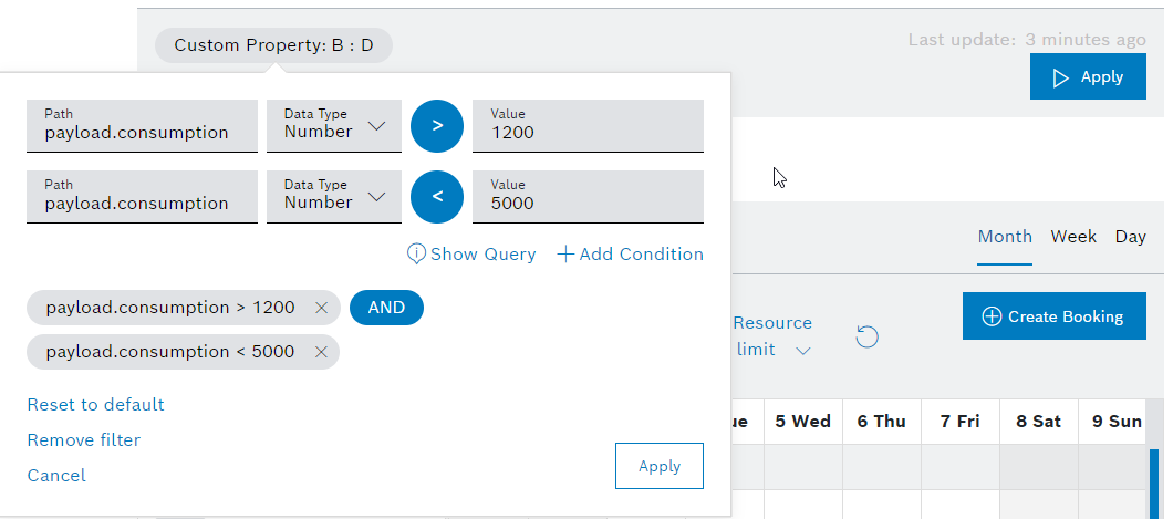 Besides using the Filter widget to filter for devices, specific date time ranges, or text, you can define query conditions. The data on your dashboard can be filtered in the same way as in the Data Browser, the Input History, and in the Users sections.