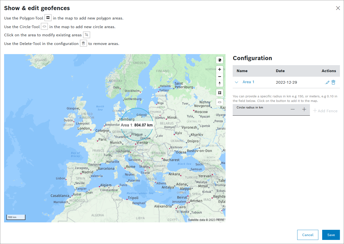 → The following dialog is displayed. - Add a geofence using one of the following icons/fields: