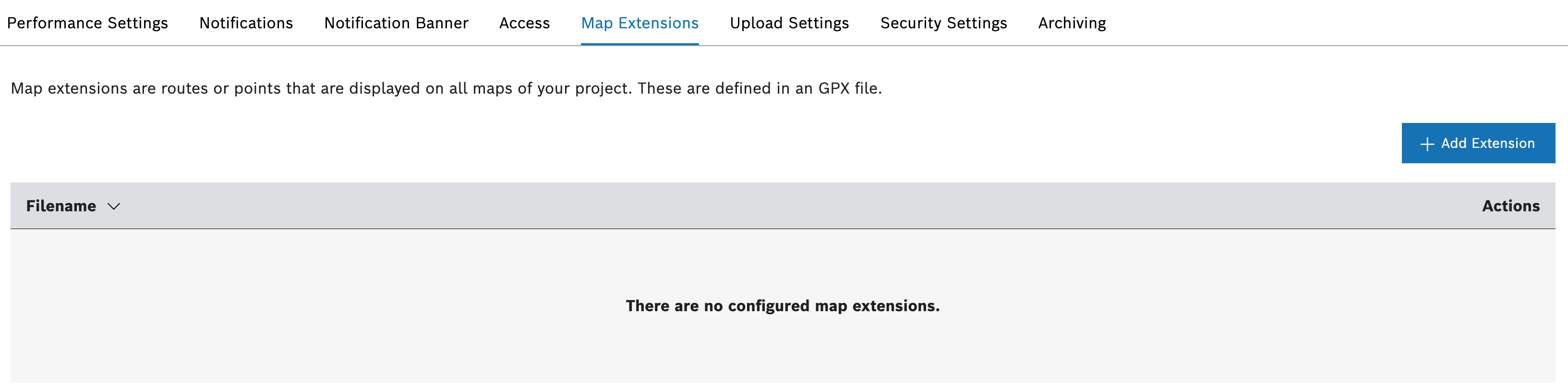Map extensions are routes or points that can be displayed on all map widgets in your project. Map extensions are defined in a GPX file which is used to store coordinate data.