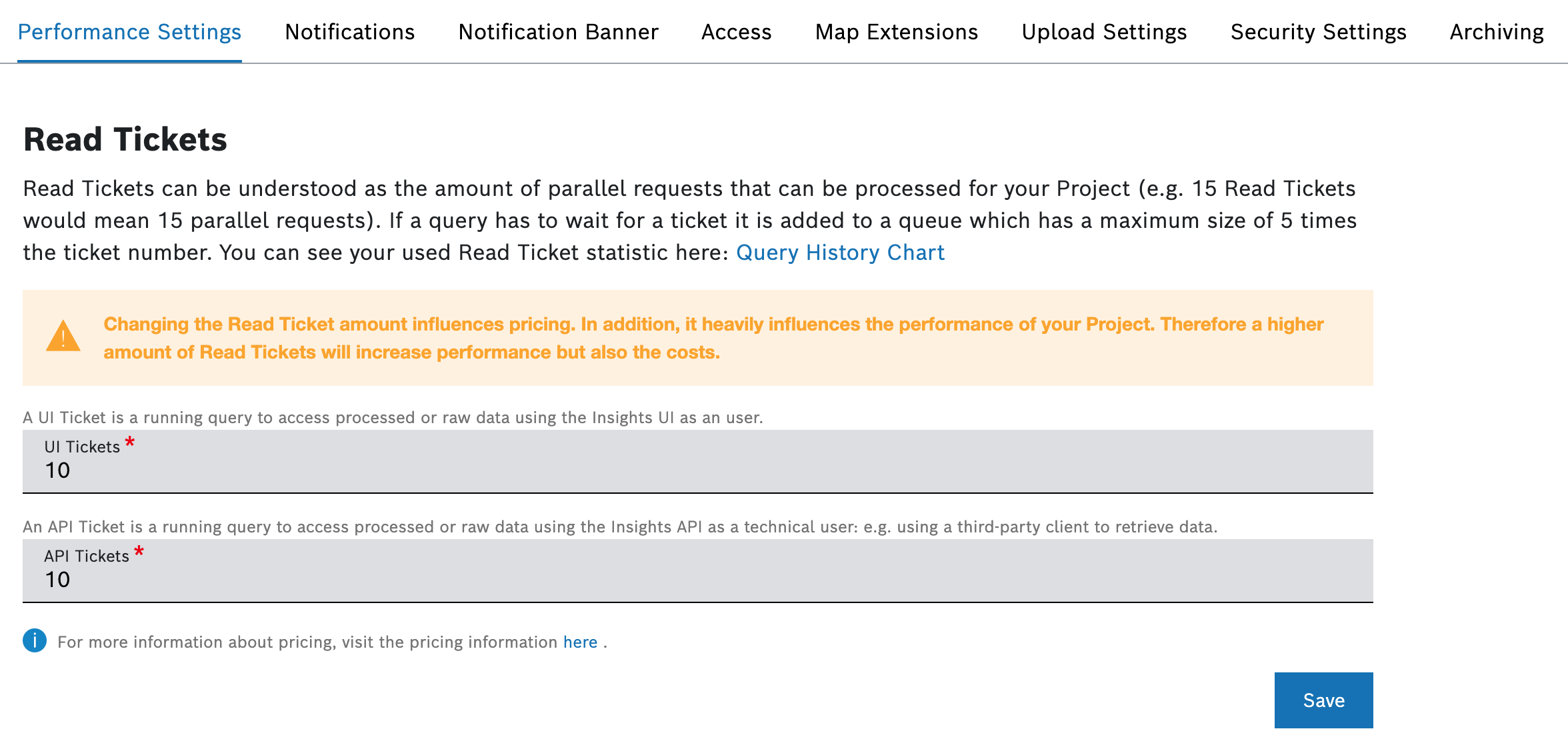 → The Performance Settings tab is displayed and shows the amount of Read Tickets that is set for your project.