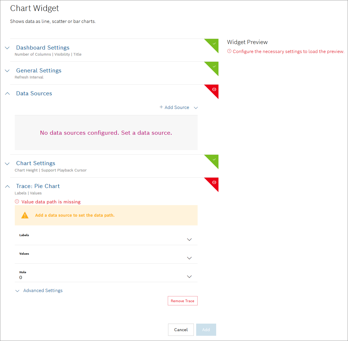 Open the Data Sources pane to configure the data source for the widget.