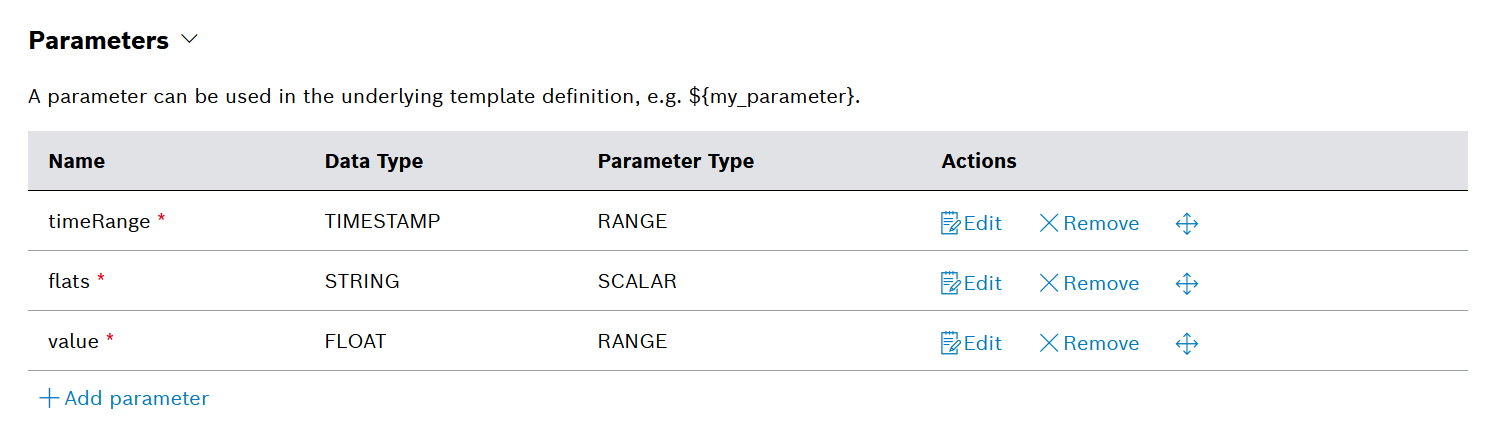 1. In the Parameters section of the Template Designer, click  Add parameter for each parameter that you are going to add: