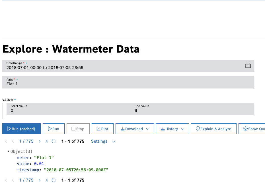 Keep in mind that all example watermeter data falls within the time range from 2018-07-01 00:00 to 2018-08-31 23:59, therefore you need to set the timeRange parameter accordingly. After selecting the respective dates, do not forget to click the Apply button under the selection.