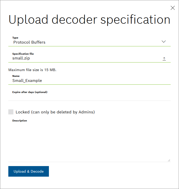 → The Upload decoder specification dialog is displayed.- In the Type drop-down list, select Protocol Buffers.