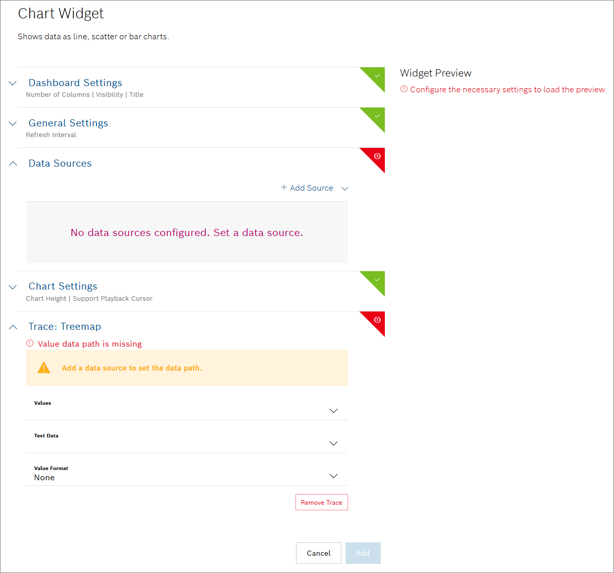 To create this widget, the following settings are mandatory to be configured: