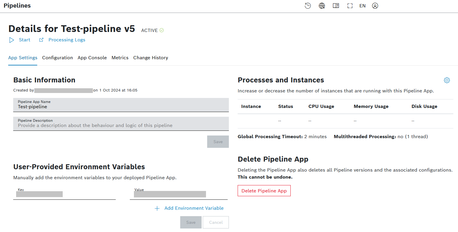 - Configuration of the pipeline app, e.g. scaling it, setting environment variables, etc., refer to Configuring a pipeline
