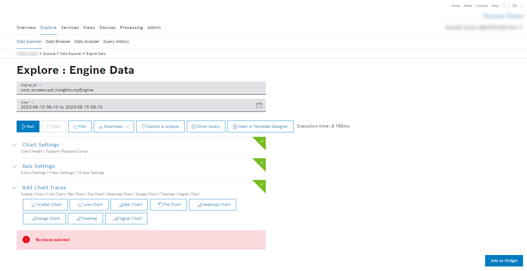 In the Template Runner, the query result can be visualized as a chart and saved as a widget to a dashboard. The query template is used as the data source.